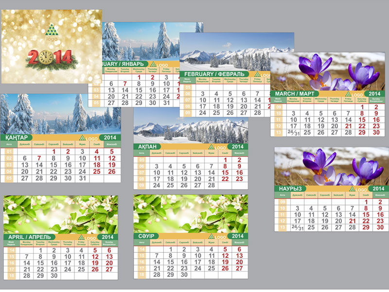 Мы предлагаем Вам календари на 2020 год. Дизайн сетки календаря уже подготовлен. Календарь на трех языках (каз., рус. и англ.). Вам остается выбрать фото и мы изготовим календарь с Вашим логотипом и адресами.