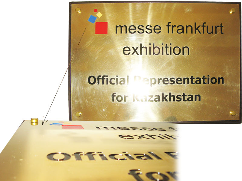 Табличка изготовлена из латуни 2 мм. с гравировкой и заливкой эмалью на декоративных болтах. Подложка ламинированный МДФ.