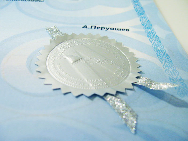 Стоимость дипломов с обьемной печатью и ленточкой зависит от тиража. 10-50 экз. = 980 тг. 50-100 экз. = 450 тг.