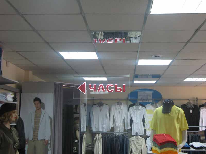 Если ваш офис, магазин или отдел находиться внутри большого помещения, где не всегда можно разместить указатель который будет видно из далека- выгодное решение это подвесной указатель из акрила. Такая конструкция легко крепиться к потолку и за счет контурной подсветки видно даже в помещении где много отвлекающих элементов.